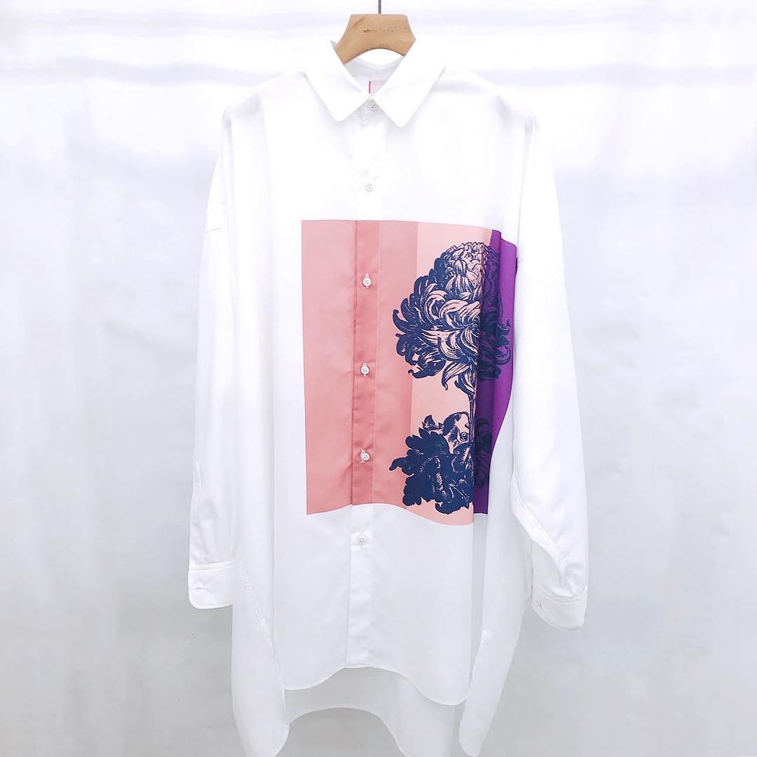 ミントデザインズの定番ビッグシャツに、大胆な転写プリントを施した1枚。クリサンセマムのモチーフにカラーブロックを重ねたグラフィカルなデザインが目を引きます。¥25,000です。(編集U)