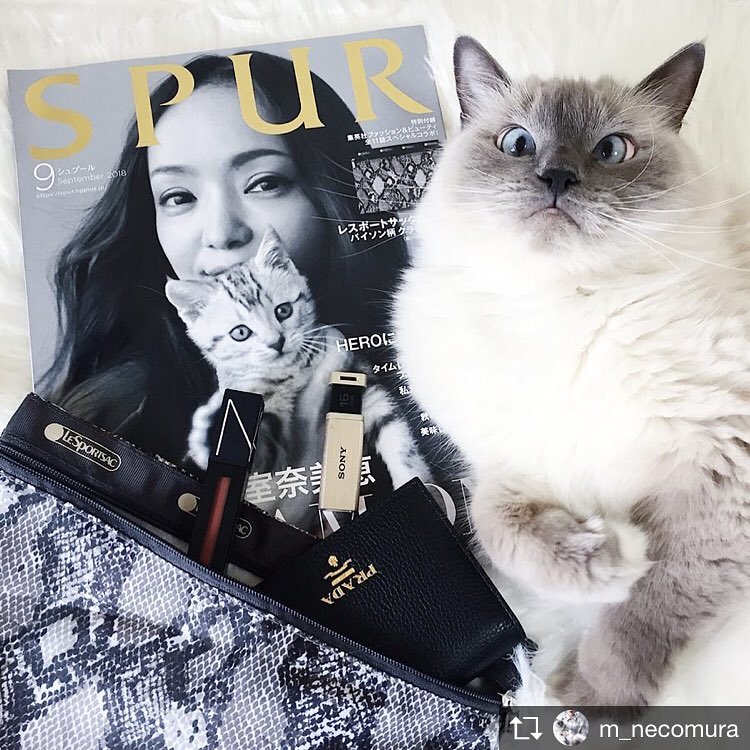 Repost from @m_necomura @TopRankRepost #TopRankRepost パイソン柄のクラッチポーチとにゃんこが可愛くて、発売を心待ちにしていたSPUR 9月号。