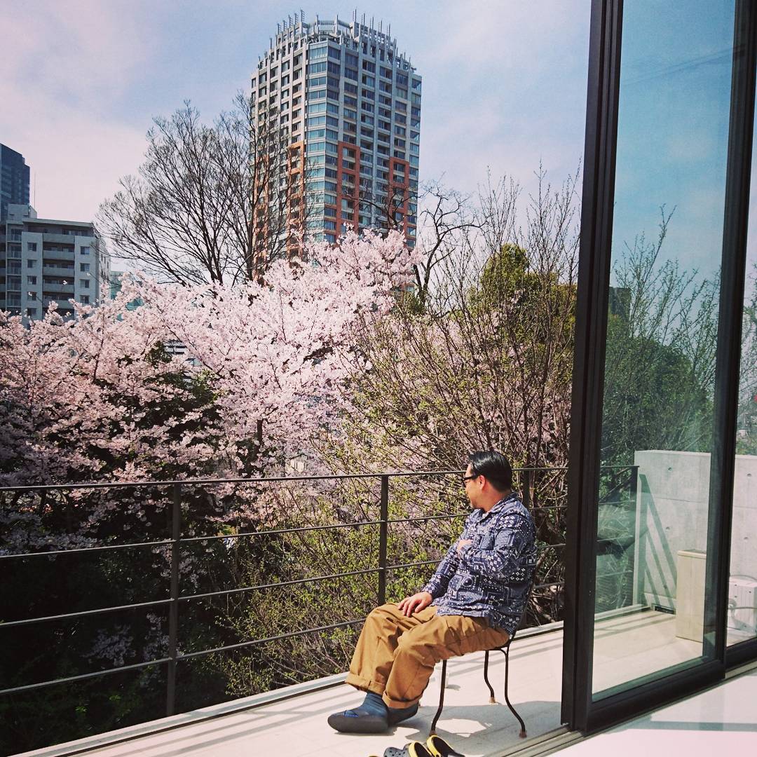 お花見してそうに見えますが、仕事中です(^O^)✴ #おじいちゃん風 #こんな家に住みたい #自然光まぶしすぎなスタジオ #サングラスマスト #sweeteditor #shooting #sakura #spring #studio #表参道 #お花見したいけどマジメに仕事 #sweeteditor