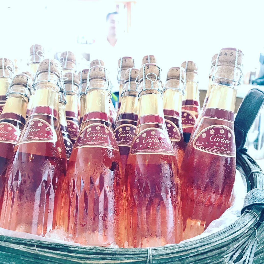 カルティエの伝説的ウォッチ「パンテール」の復活を祝うイベントがLAで開催。ランチパーティはマリブのビーチハウスで。ゲストに供されるカルティエ特製のシャンペンはミニボトルが可愛い。