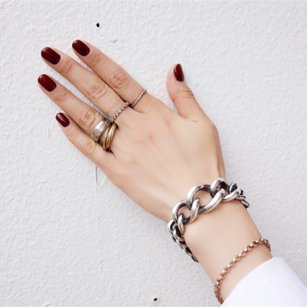 先日のhumの展示会でスナップした、デザイナーの稲沼さんの手もと。大ぶりなデザインと華奢なアイテムをバランス良く重ねづけするセンスは流石です。どれも素敵だけど、やっぱり個人的に気になるのはシルバーのチェーンブレスレット。稲沼さんがつけているのはメンズコレクションですが、細い手首にあえてこの大きさをチョイスするのが潔くてカッコいい。ぷっくりとしたチェーンなので、クールだけどいかつくないのもhumならではの魅力です。(編集H)
