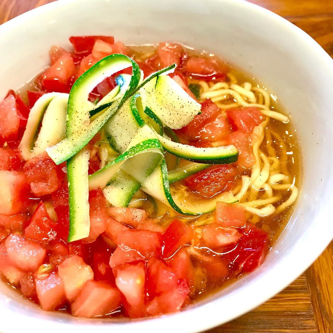 しょうゆ味の即席麺にズッキーニとトマト、酢とこしょうを入れるだけでいつもの即席麺がさっぱりとしたサンラータン風のラーメンに😀