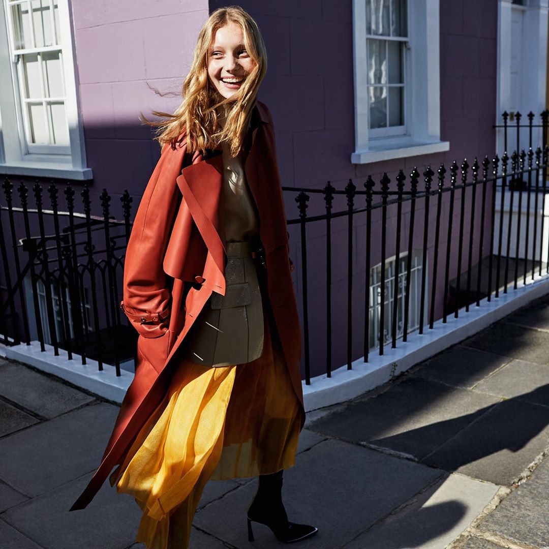 シルクオーガンジーのシャツとプリーツスカートのエアリーなコーディネートに、なめらかなラムレザーのトレンチコートを羽織って。リュクスな素材で表現する軽やかさは、秋の始まりのおしゃれの鍵。