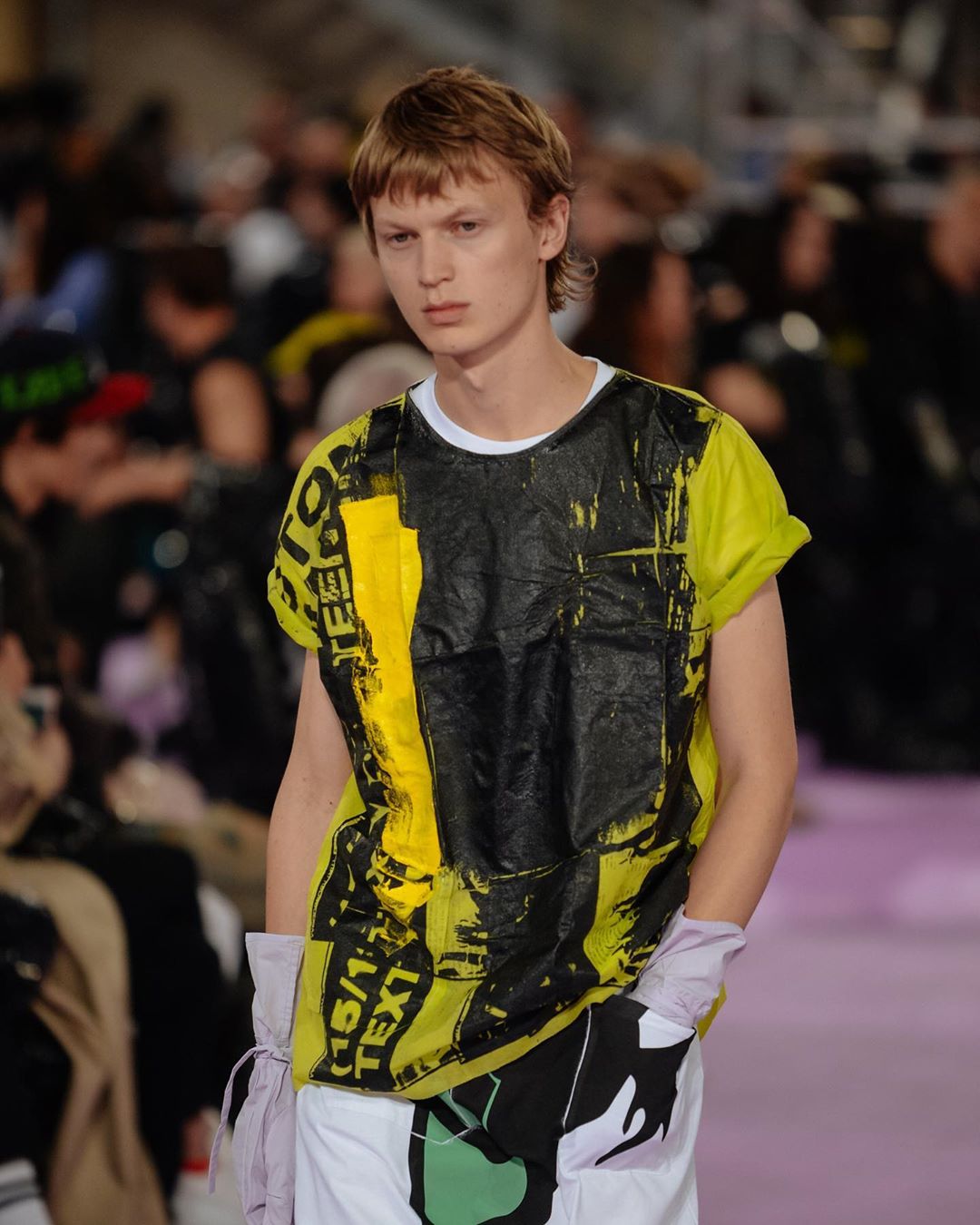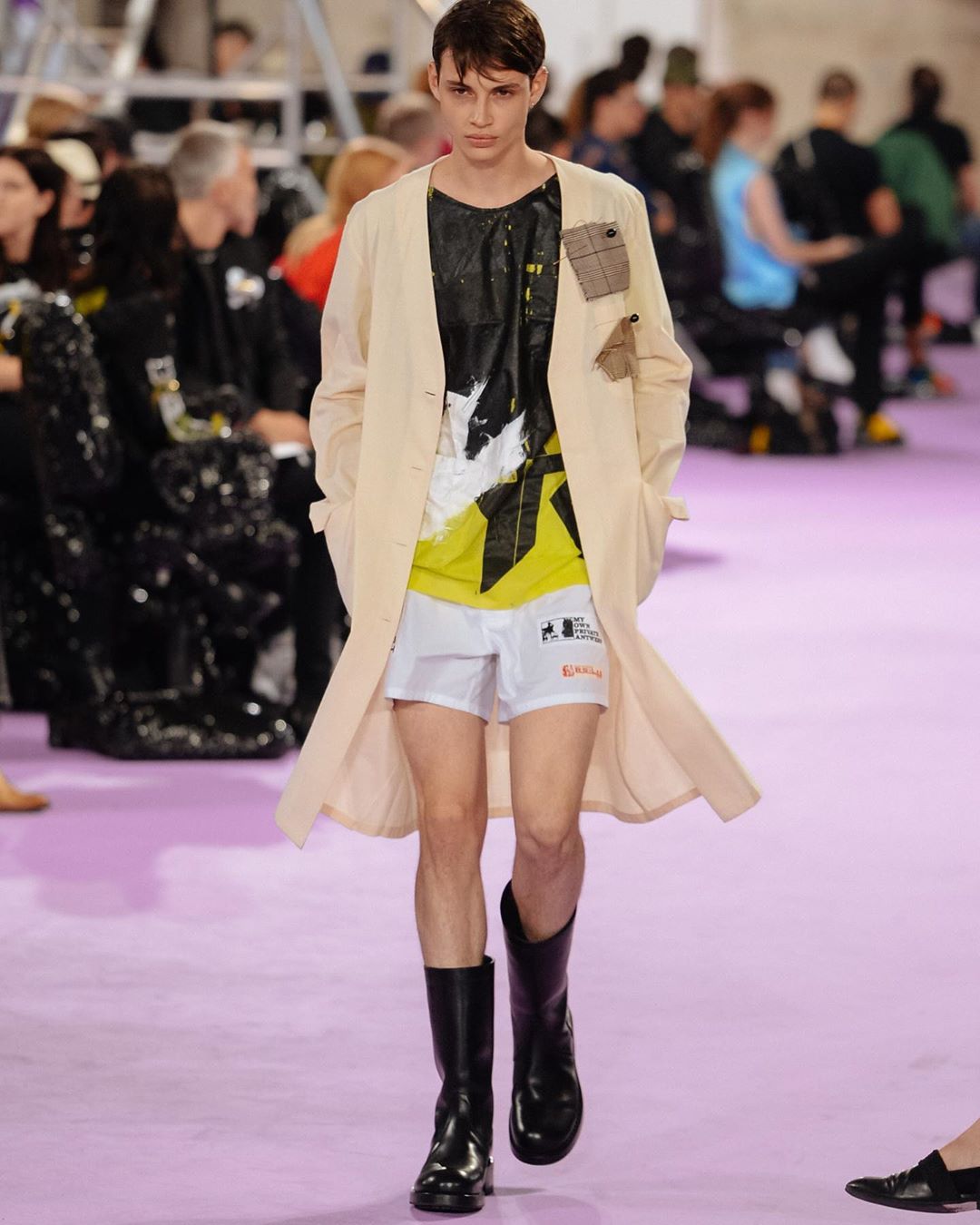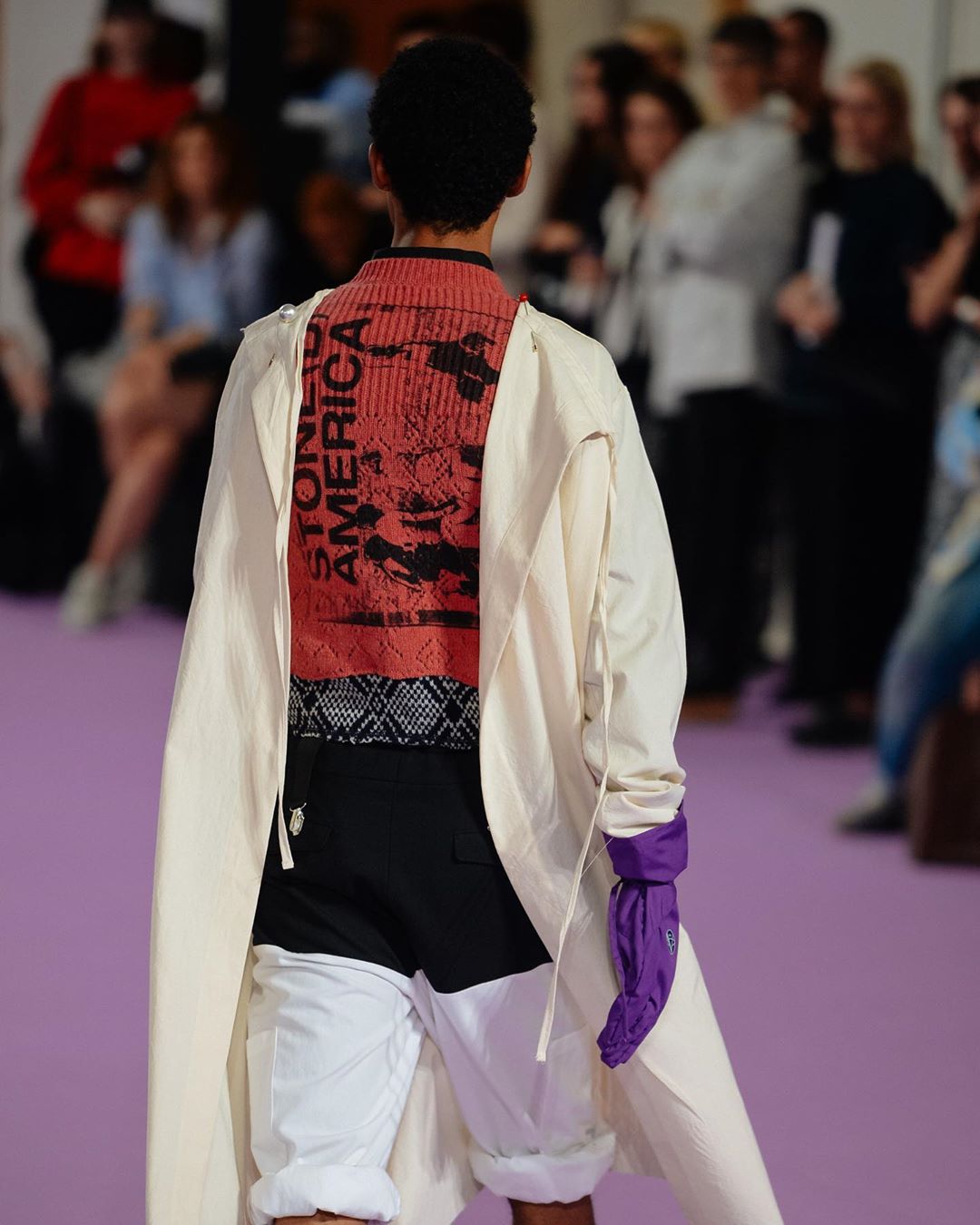 アメリカに対する批判的なメッセージを読み上げるBGMでスタートしたショーには、「STONE(D) AMERICA」と「MY OWN PRIVATE ANTWERP」いうスローガンが並ぶアイテムがいくつも登場した。 「MY OWN PRIVATE ANTWERP」の直訳は「私だけのアントワープ」だ。おそらく1991年公開の米映画「マイ プライベート アイダホ(原題:MY OWN PRAIVATE IDAHO)」から引用したと考えられる。