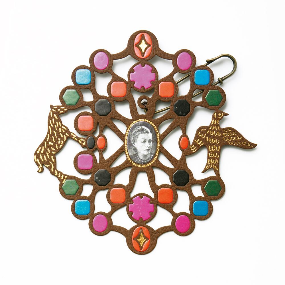 写真は、D-BROSの紙象嵌と箔押しを使った紙のブローチ / 2005