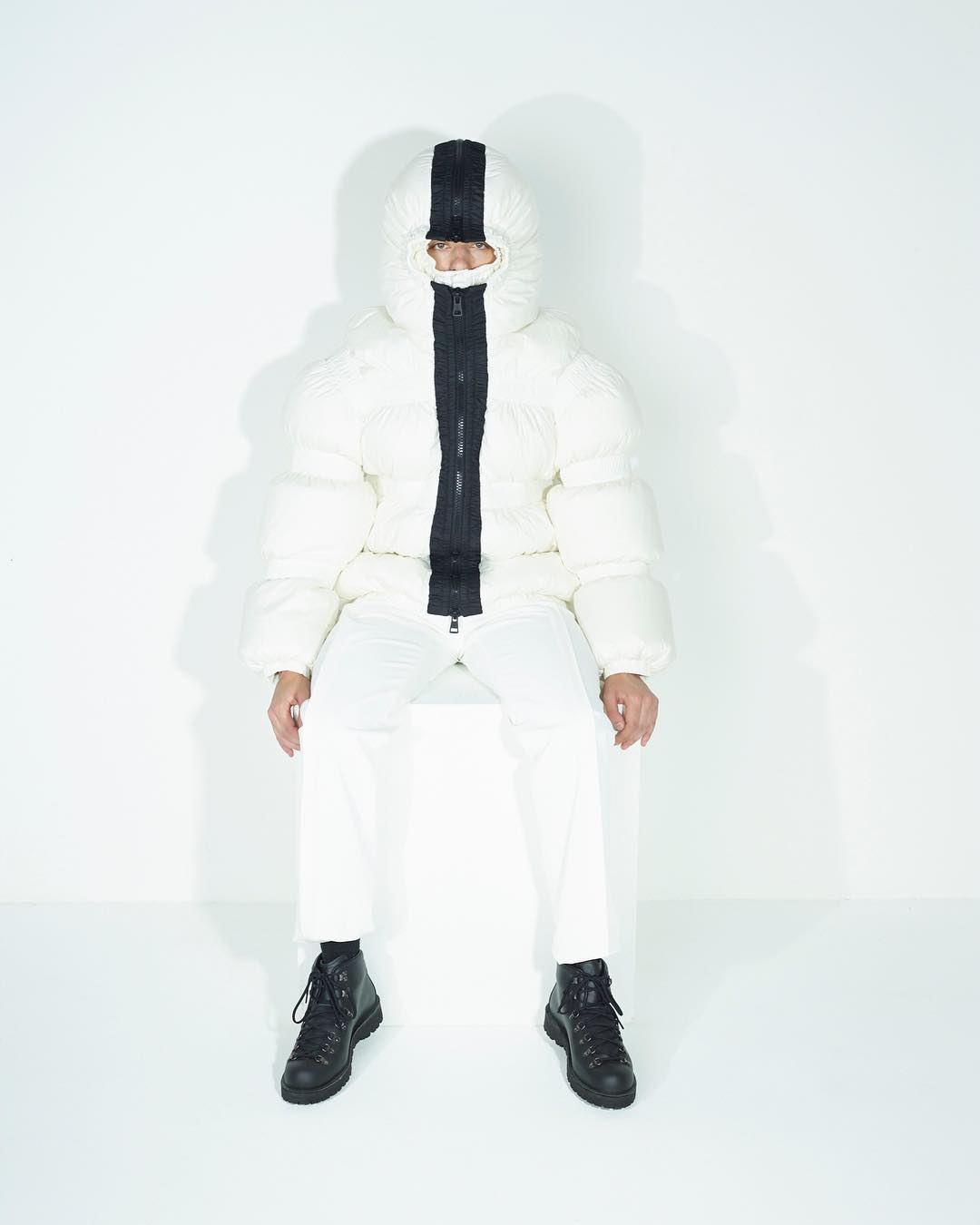 8人のデザイナーによる、8つのコレクションで構成される「モンクレール ジーニアス」。写真は英国のクレイグ・グリーンが手がける「5 モンクレール クレイグ・グリーン」のアイテム。ボディと顔を完全に隠すことで、コレクションのテーマのひとつ“プロテクション”を表現したダウンジャケットです。あえて余分なボリュームと、マスクのようなダブルフードにより、まるで彫刻のオブジェのように肥大化を遂げたシェイプが圧巻。