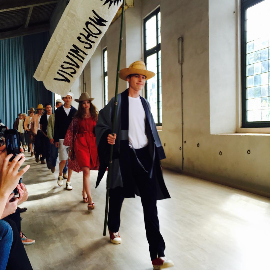 メンズファッションの見本市ピッティ・ウォモのゲストデザイナーとして〈VISVIM〉が初のランウェイショーを開催。先頭のモデルが手にしているのは鯉のぼりです。