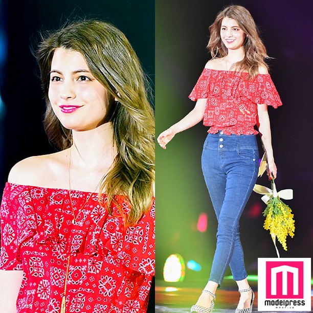 本日 #モデルプレス は東京・代々木体育館で行われている 「#GirlsAward」会場からお届けしています。 * #マギー ちゃんがペイズリー柄が施されている赤いオフショルダーにハイウエストのデニムパンツを合わせ、大人カジュアルなコーディネート♡デコルテも美しいですね♡