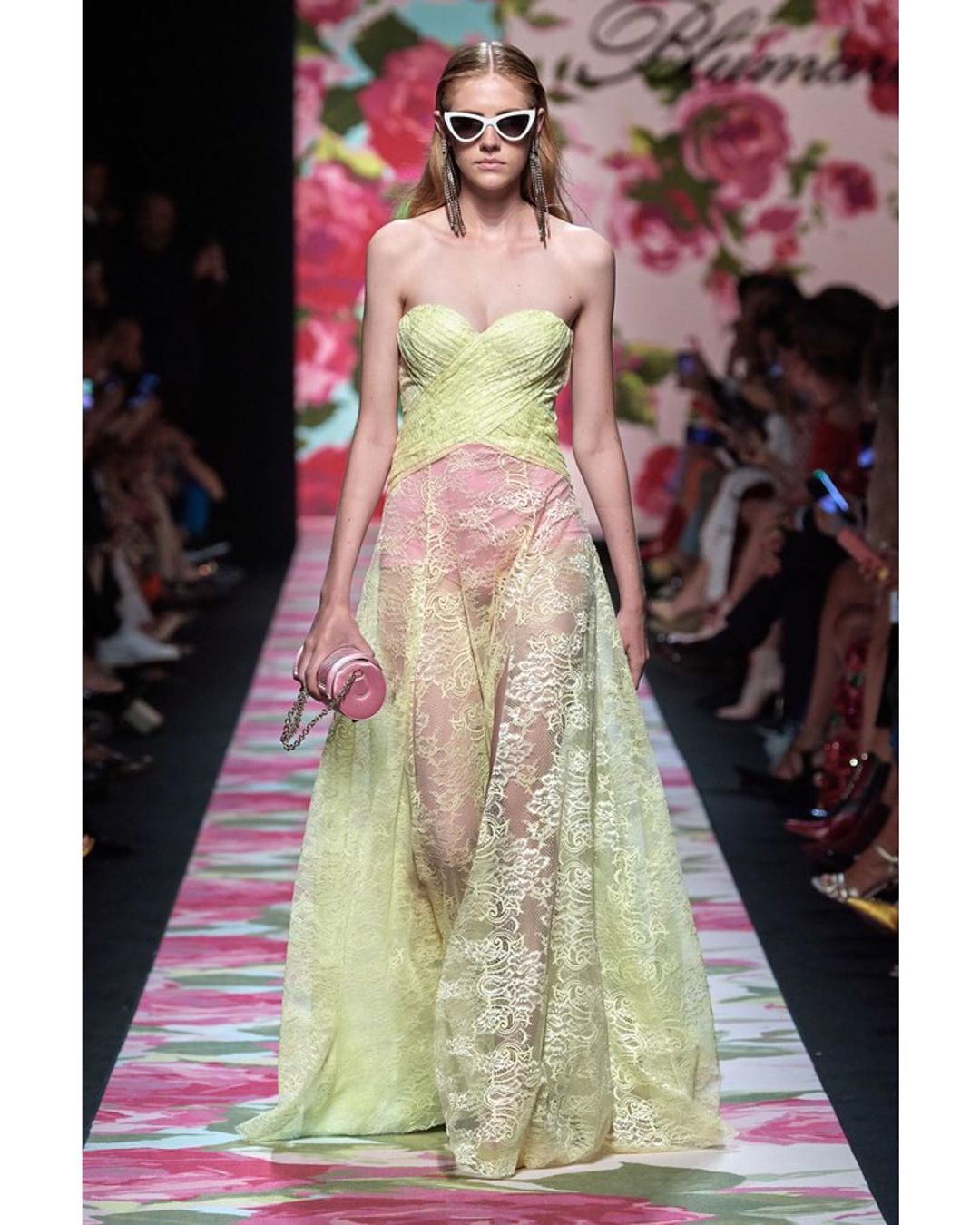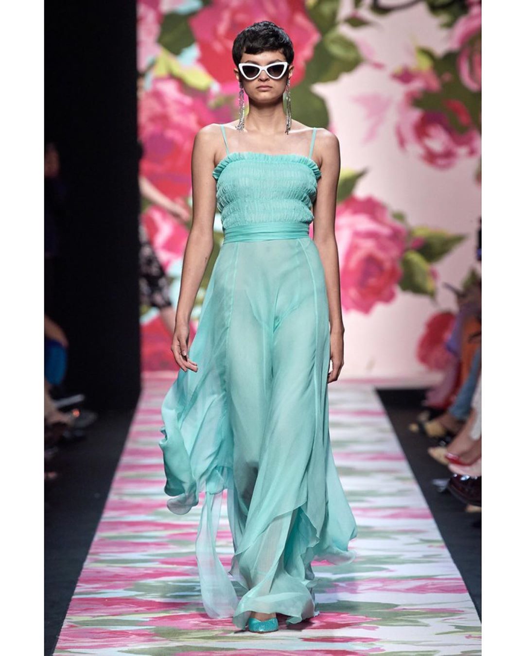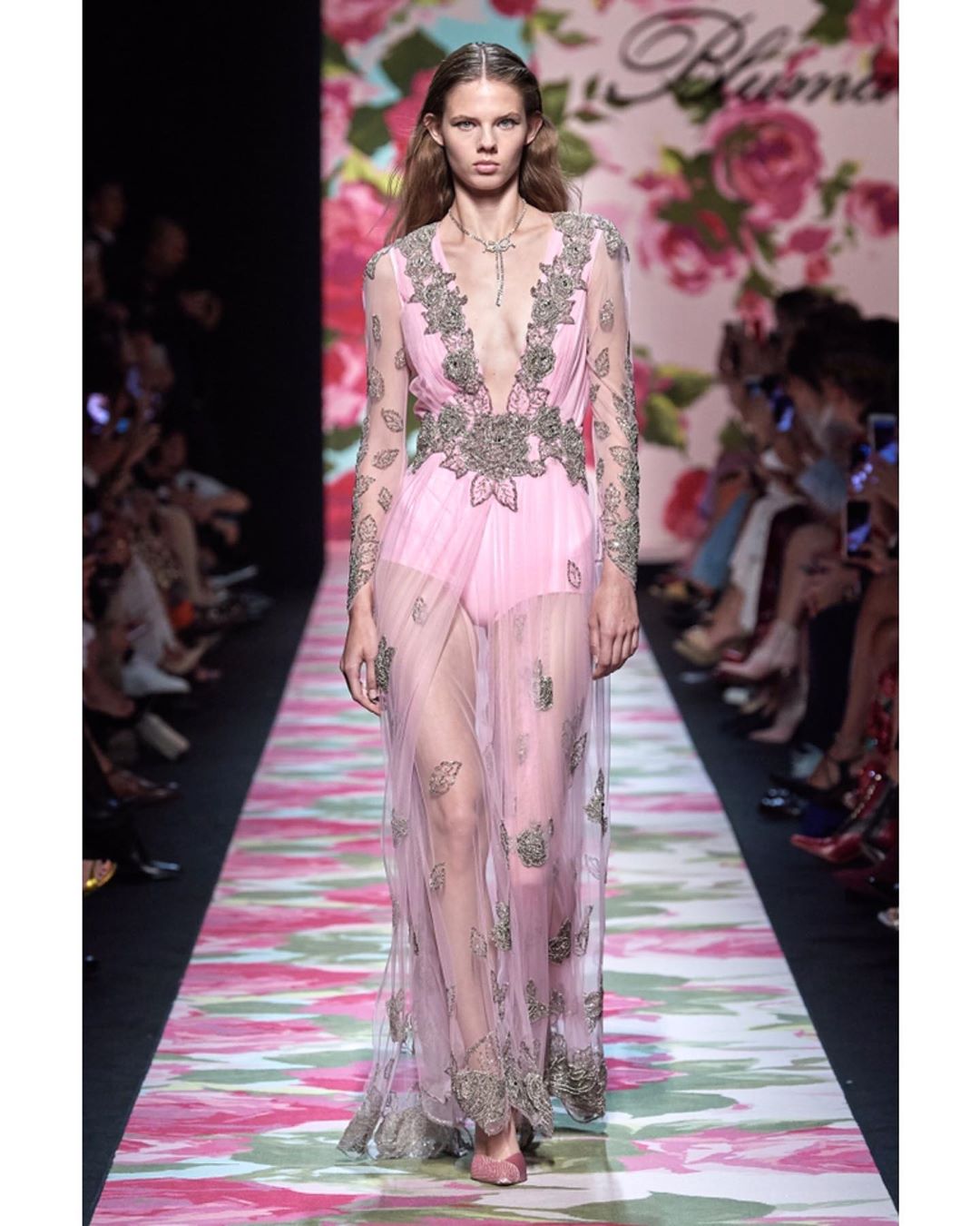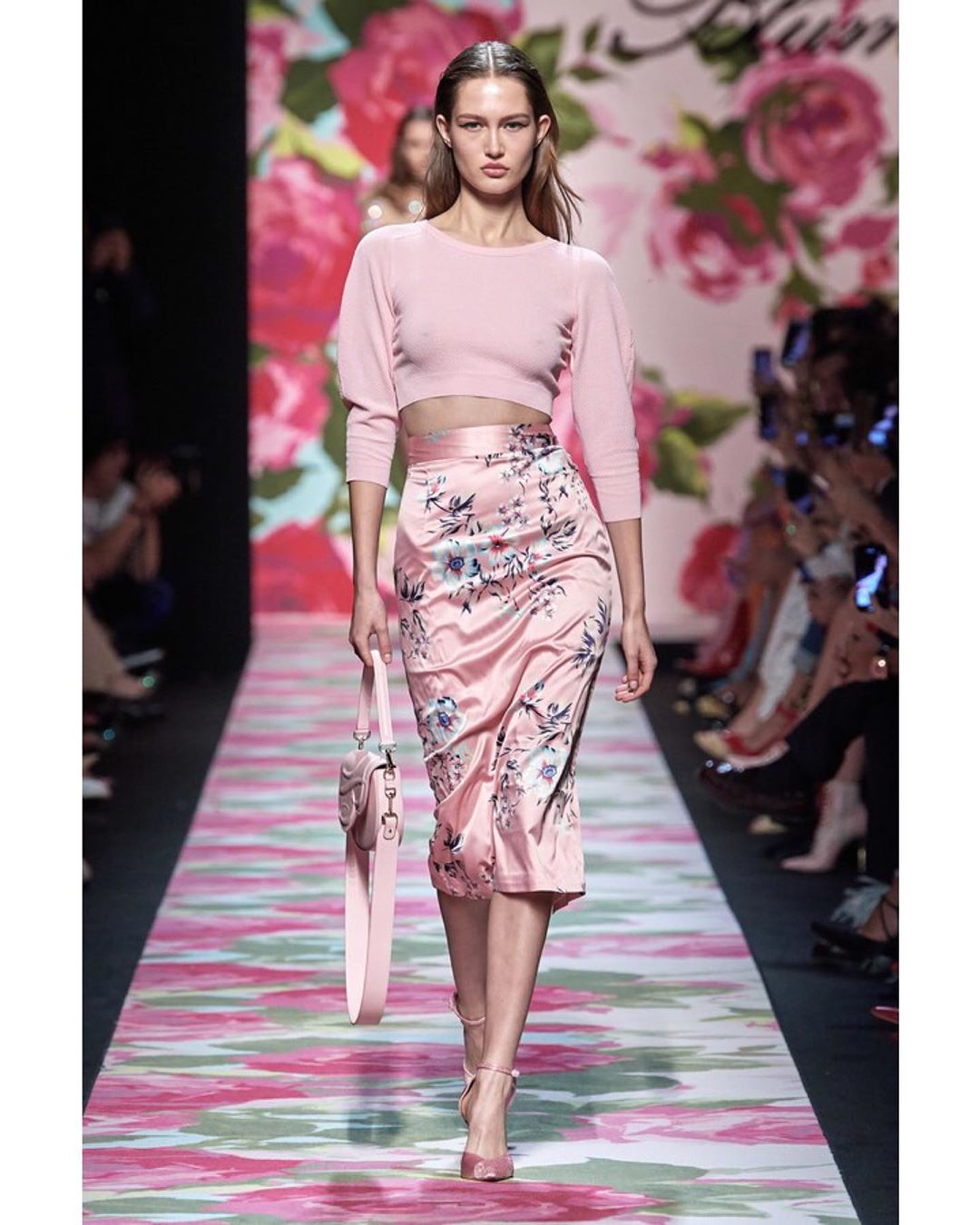 Blumarine showcased its Spring collection, which was filled with floral motifs including even the catwalk. The pastel color palette set the entire mood of the show dreamy and romantic.#mfw #SS20 #blumarine