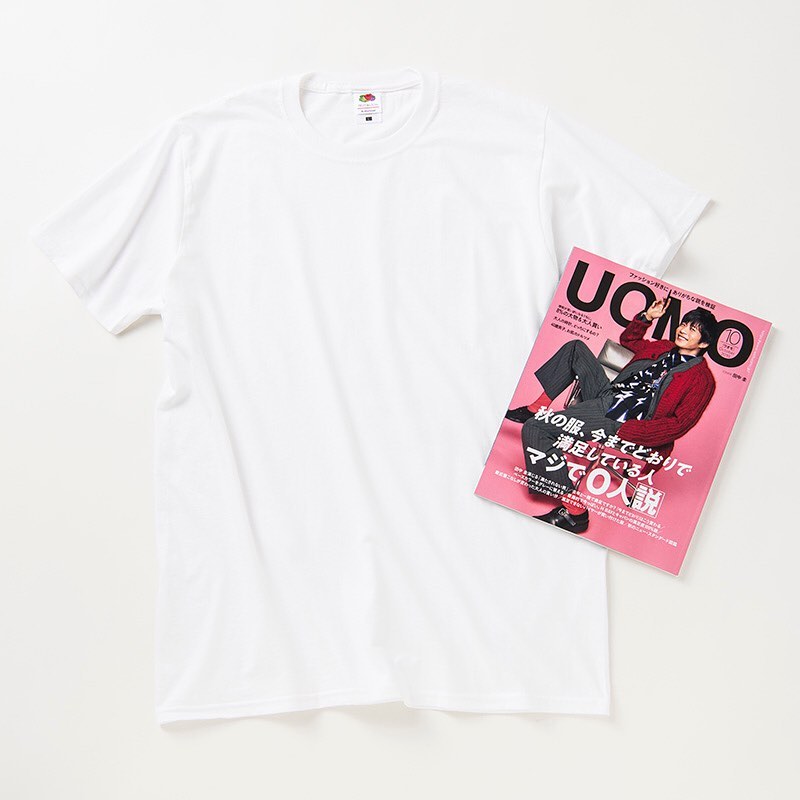 UOMO2019年10月号の本誌と、フルーツ オブ ザ ルームのクルーTシャツ(白無地、Lサイズ)1枚がセットになったこのパック、価格はなんと1,000円(税別)‼️ 完売必至、お急ぎください。