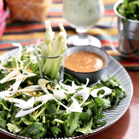 玉ねぎベースのドレッシングは、スイートチリソースの控えめな甘さがパクチーと相性抜群。箸が止まらないおいしさです。