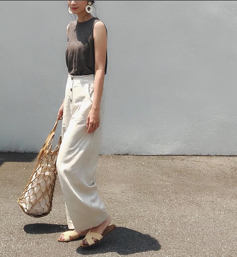 トリプルボタンが特徴的なリネンパンツがアクセントになってこなれたシンプルコーデに💕