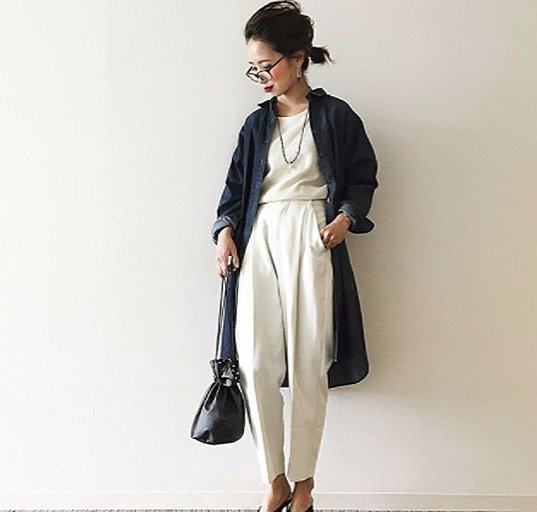 オールホワイトコーデにデニムのロングジャケットを