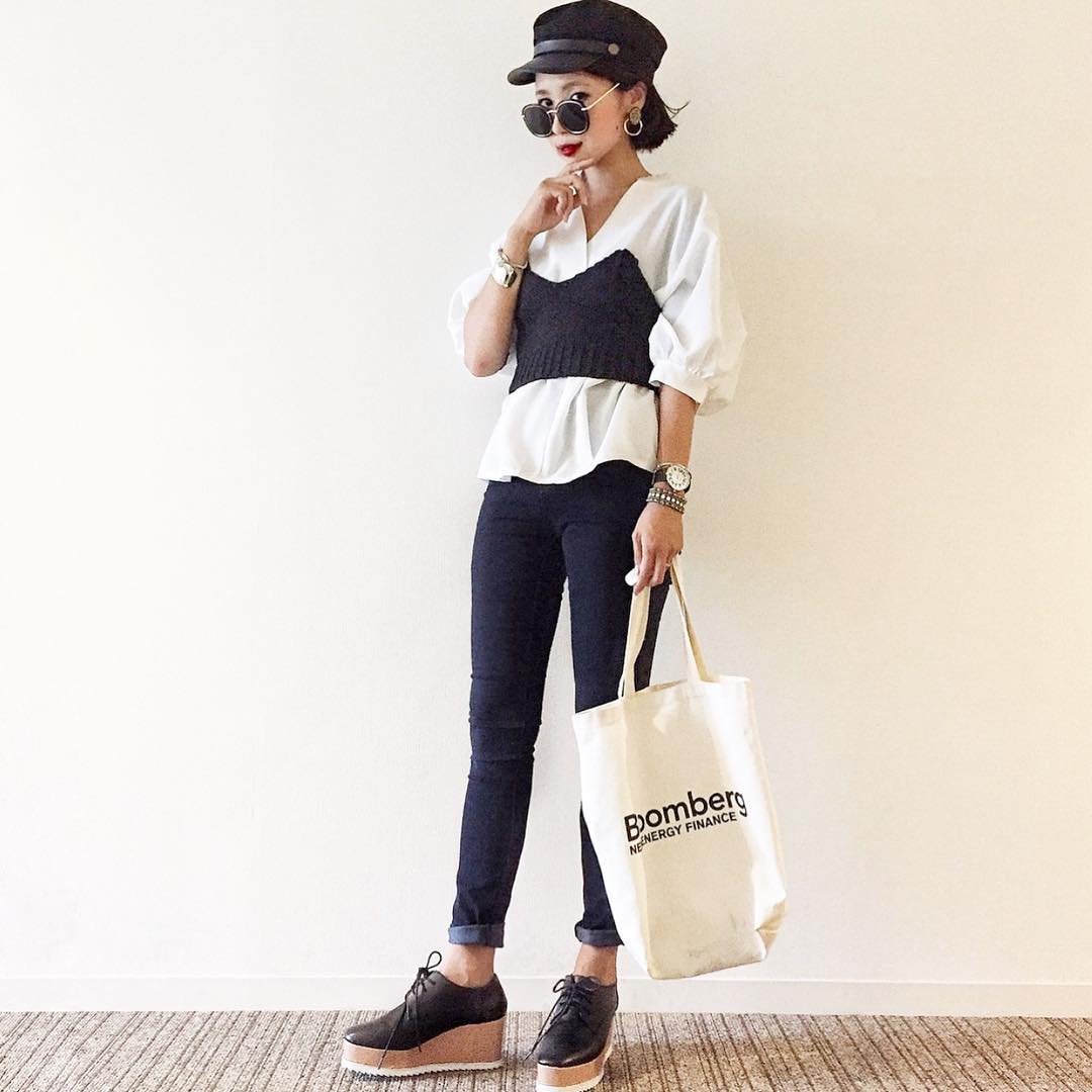 トップスの上にビスチェでレイヤードを作るおしゃれスタイル😊