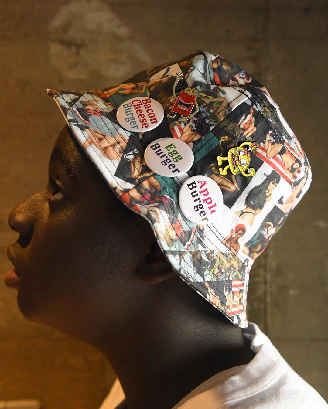 バーガーめぐりには欠かせない名店のバッジ。セクシーなお姉さんがちりばめられたハットはリバーシブルで、その時々の興味を象徴するバッジを気軽にオンするのが今の気分だ。#popeyemagazine #burger