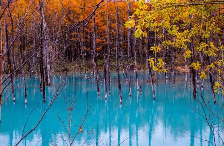 北海道にある青い池。コバルトブルーの青い景色はそれだけでも美しいのですが、秋には紅葉と一緒に眺めることができるんです。