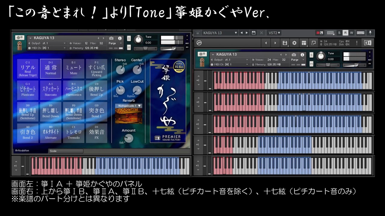 ※十七絃の一部の音が音域の関係で「箏姫かぐや」で出せないため、その音は1オクターブ下げています。