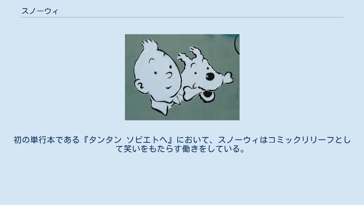 初の単行本である『タンタン ソビエトへ』において、スノーウィはコミックリリーフとして笑いをもたらす働きをしている。
