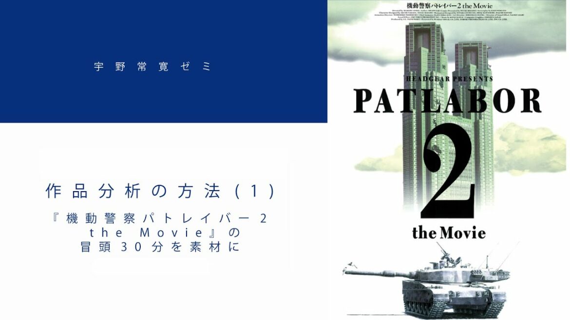 第1回は「作品分析の方法」がテーマです。映画『機動警察パトレイバー2 the movie』の冒頭30分を題材に、宇野が普段行っている作品分析の思考回路を開陳。そこで描かれたものをどのように把握し、分析し、そして作品外のものと関連付け、論点を設定し、批評するかを解説します。