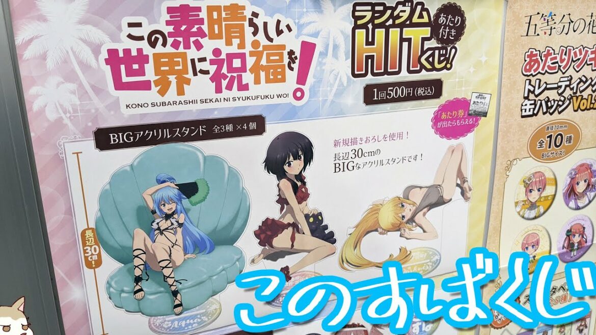 今回は描き下ろし水着衣装のアクア、めぐみん、ダクネスのBIGサイズアクリルスタンドが当たり枠に設定されています