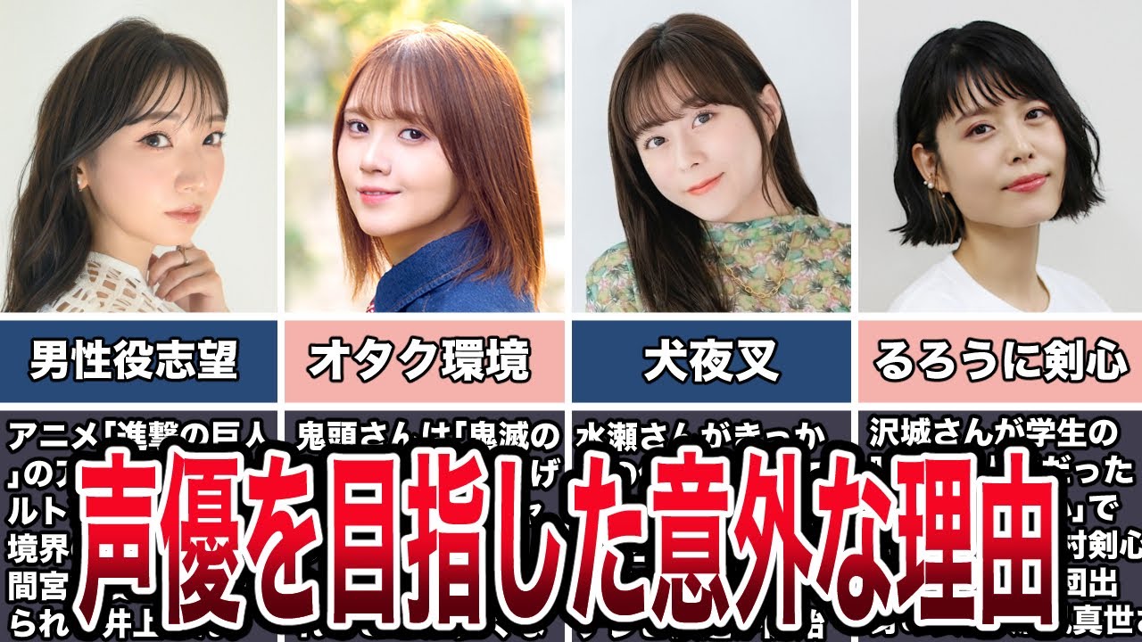 このチャンネルでは、声優に関するお話を色々投稿していきます! 今回は、『女性声優が声優を目指した意外な理由4選』となります。 子役や役者の延長線として声優になった方が多いですが、 他の理由で声優になった方がいれば是非コメントで教えてください! 【目次】 0:00 井上麻里奈 2:47 鬼頭明里 5:14 水瀬いのり 7:07 沢城みゆき #声優 #人気声優 #女性声優 #アニメ それが声優! Write A Commentコメントを投稿するにはログインしてください。