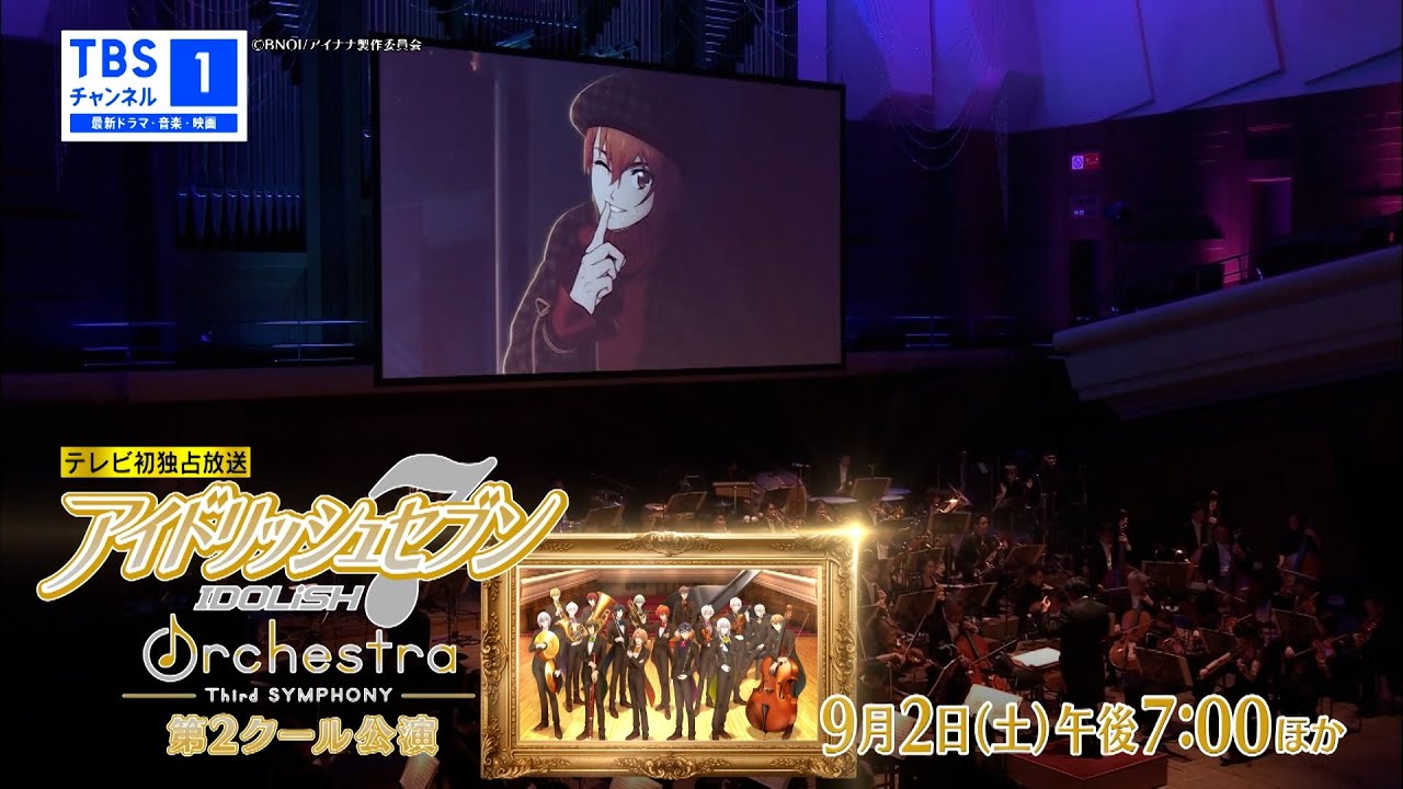 TVアニメ「アイドリッシュセブン Third BEAT!」第2クールを彩った楽曲の数々を迫力のオーケストラ演奏でお送りする最新公演!2023年4月23日に行われた「アイドリッシュセブン オーケストラ -Third SYMPHONY-」第2クール公演の模様をTBSチャンネル1で9月2日(土)午後7時からTV初放送します。指揮者・西谷亮さんと新日本フィルハーモニー交響楽団&ゲストプレイヤーによる演奏でお届け。スクリーンで展開される映像と大迫力のサウンドが重なり合う、“オケナナ”ならではの感動を体感してください!
