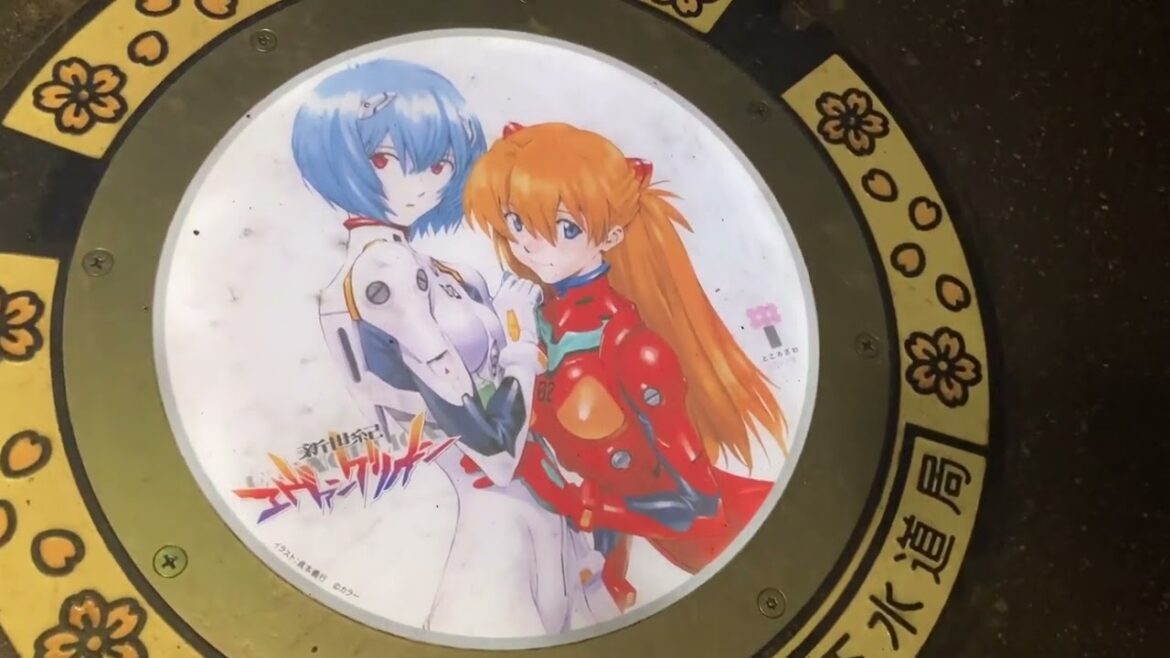 所沢サクラタウンのアニメマンホール。KADOKAWA武蔵野ミュージアム。エヴァンゲリオン、ガンダム、狼と香辛料、ソードアートオンライン