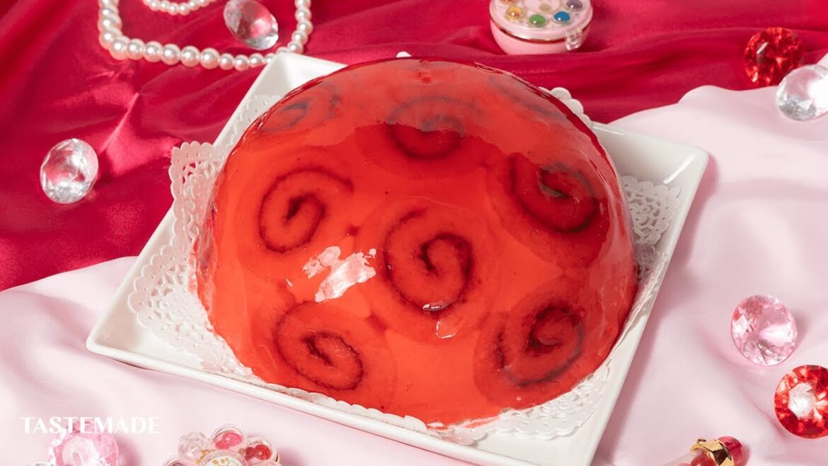 ロールケーキを敷き詰めたドームに、鮮やかな赤いグラサージュをかけるのがポイントです❤️