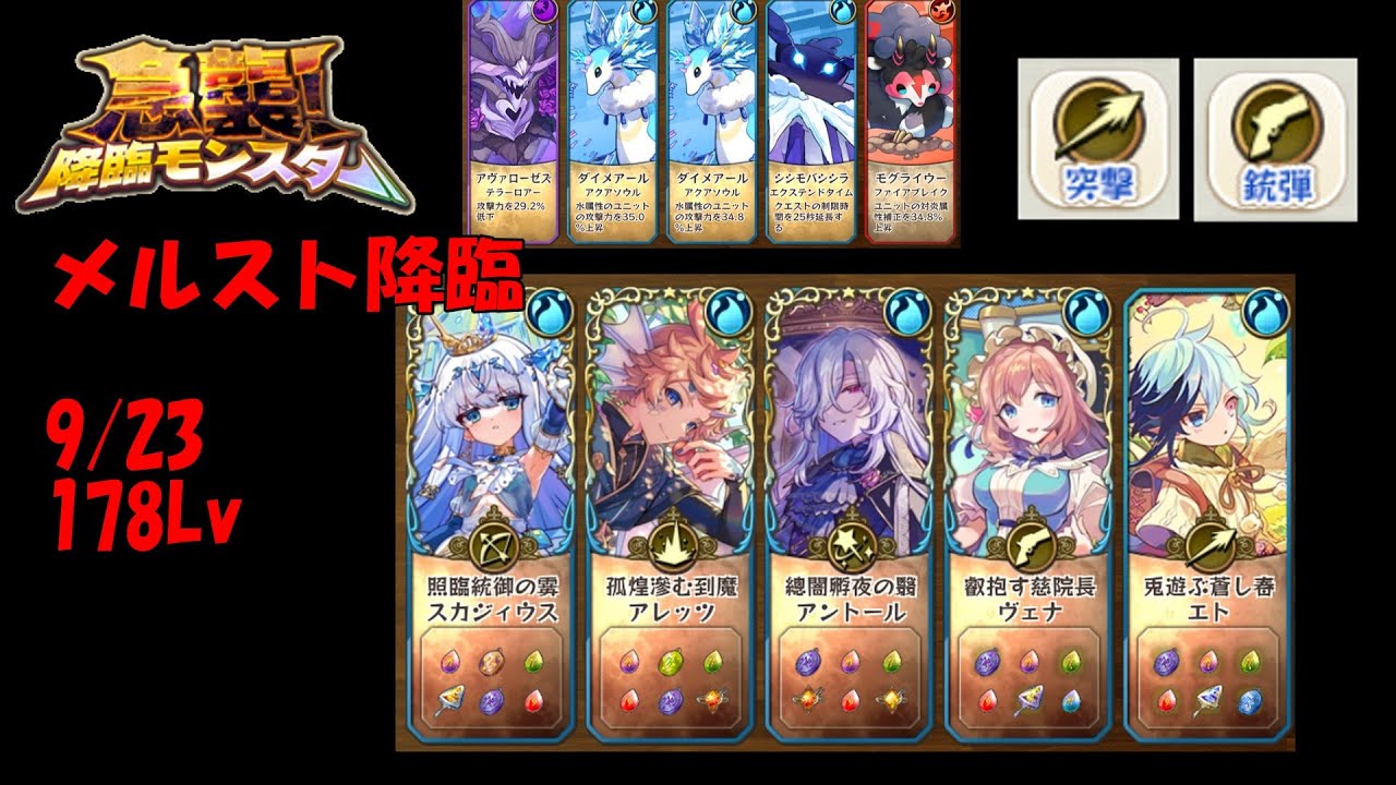 4部位 水有利 特攻エト&ヴェナ 174の時から変えたポイント ・救援火力を5体増やしました。 ・エトのナイトルーンを魔力値15に変更 あと1~2レベルまではいけそうです。 朝の部の解説 夜の部の解説 想定編成 #メルクストーリア #メルスト メルスト降臨 メルクストーリア -無気力少年と瓶の中の少女- Write A Commentコメントを投稿するにはログインしてください。