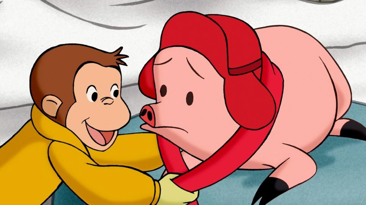 ジョージは雪の中で迷いブタを見つけ、暖かい帽子とマフラーを渡して家に連れて帰ります。
