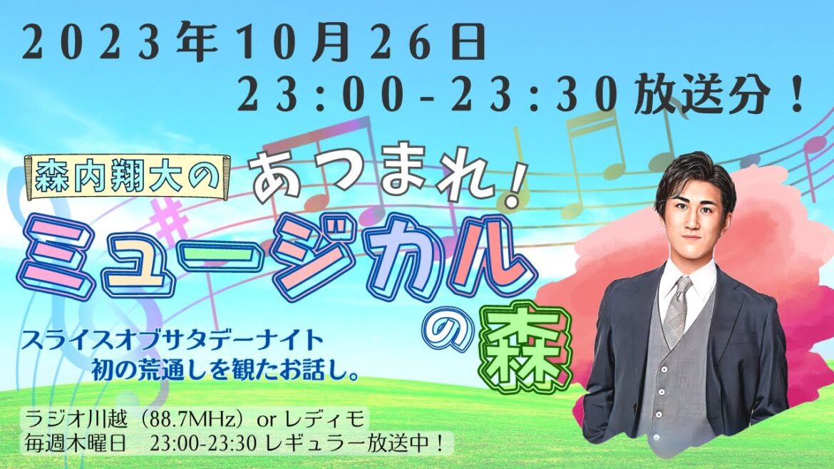毎週木曜日23:00からはミュージカル俳優 森内翔大が30分間、皆様にミュージカルに少しでも興味を持って頂けるようにあらゆる情報を楽しくお伝えしていきます! 「森内翔大の!あつまれ!ミュージカルの森」略して「あつミュ」 ミュージカル出演時の稽古の様子や、本番期間中のエピソードもラジオでお話をしています。 川越にミュージカルを根付かせたい!をモットーにたくさんのミュージカル情報をなるべくわかりやすく、時にディープにお話ししています。