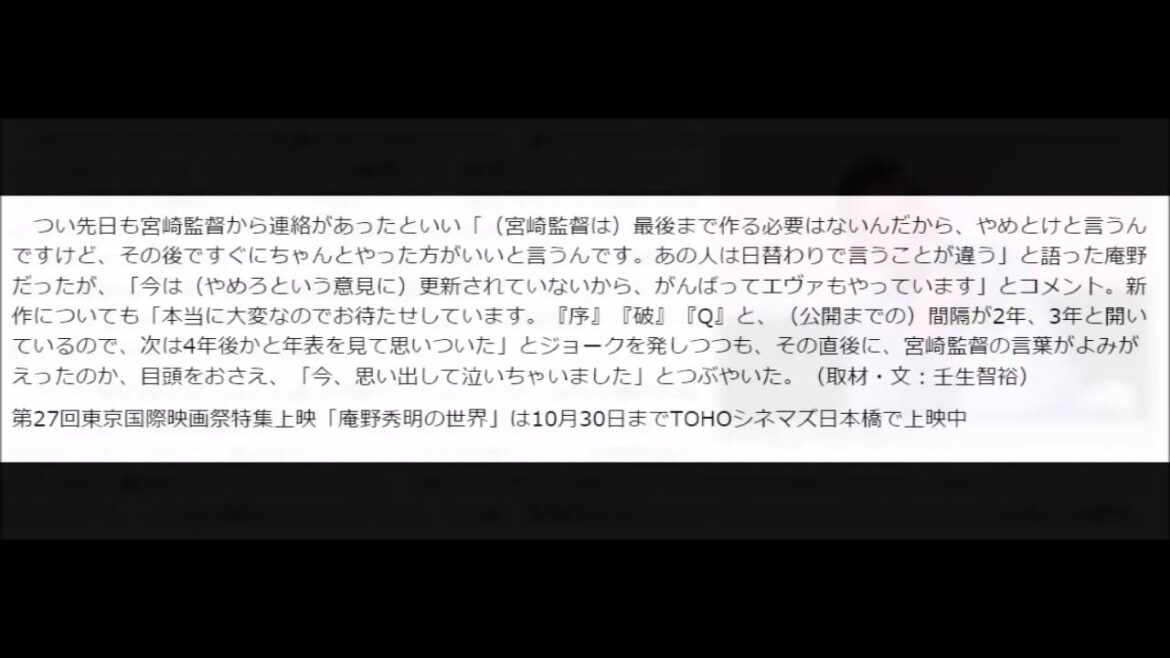 映画監督の庵野秀明が27日、TOHOシネマズ日本橋で行われた、第27回東京国際映画祭の特集企画「庵野秀明の世界」内のプログラム『新世紀エヴァンゲリオン劇場版 DEATH(TRUE)2/Air/まごころを、君に』上映に出席、「エヴァ」の制作で身も心もボロボロになったとき、宮崎駿監督に励まされた過去を振り返った。