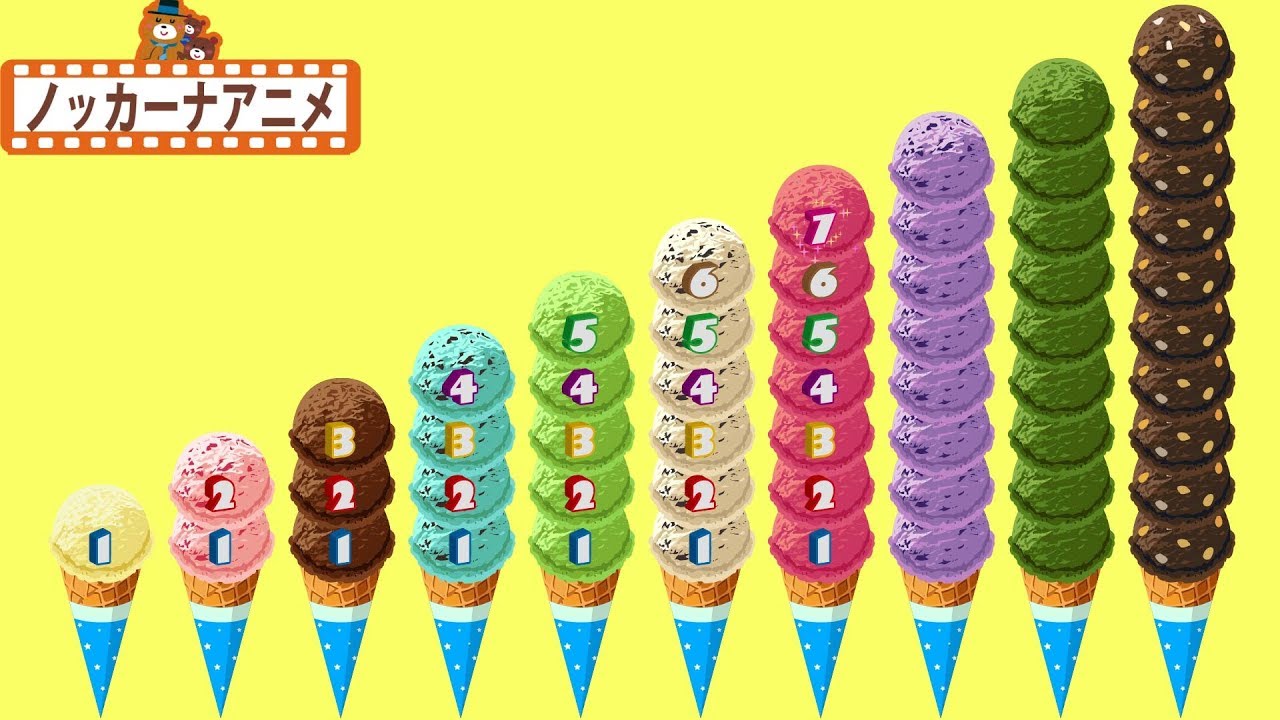 アイスクリームの数をかぞえて1から10までの数字をおぼえる子供向けアニメです。