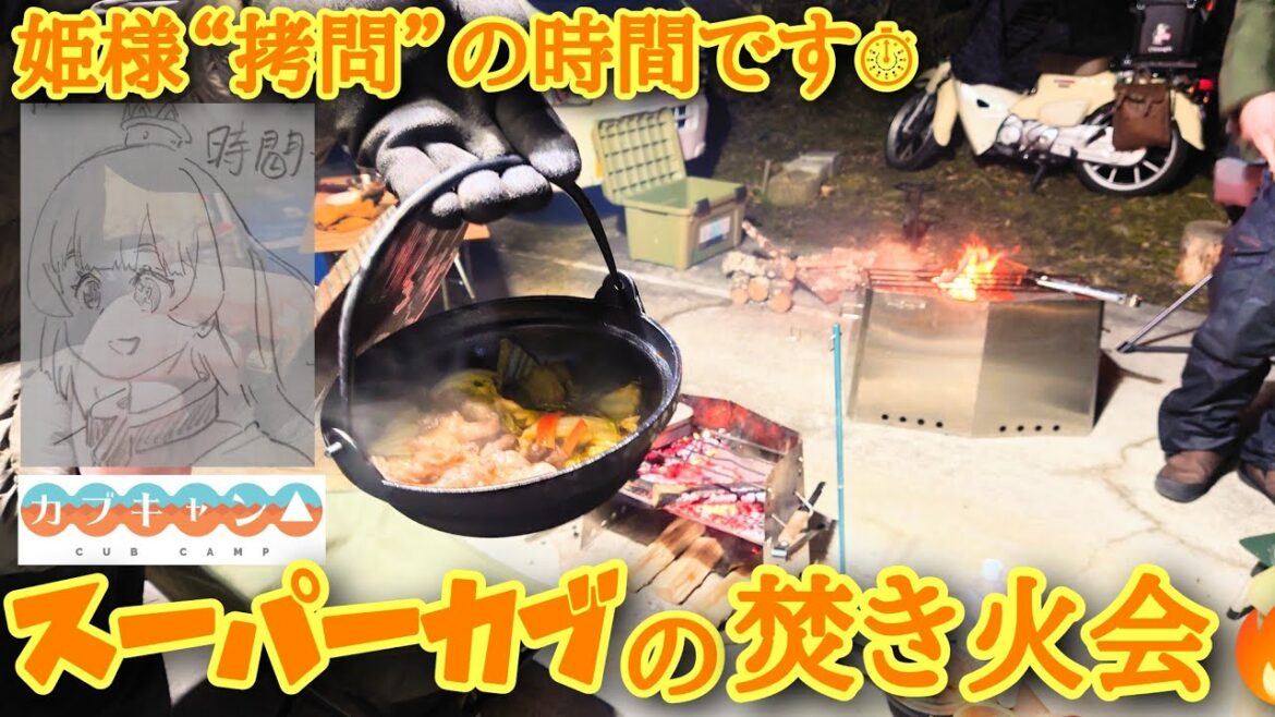 『姫様“拷問”の時間です』 風 スーパーカブの焚き火会ツーリング ユニフレーム 薪グリル すき焼き【カブキャン】JA59 ひめさまごうもんのじかんです