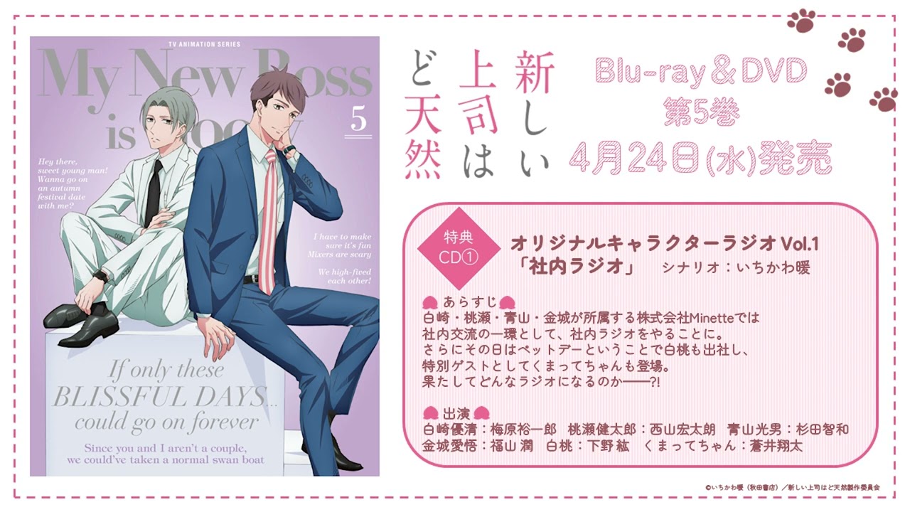 TVアニメ「新しい上司はど天然」Blu-ray&DVD第5巻 完全生産限定特典として、特典CD:オリジナルキャラクターラジオ Vol.1「社内ラジオ」の収録が決定!