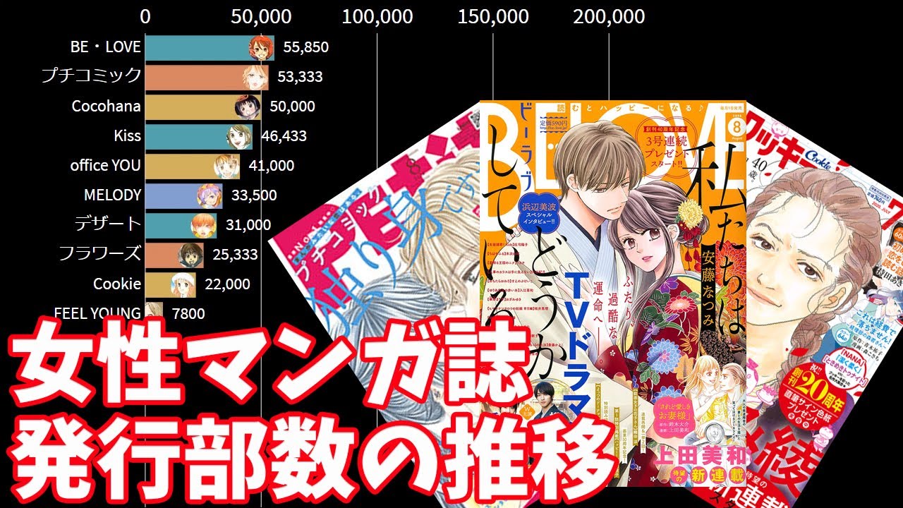 『逃げ恥』『のだめカンタービレ』『ちはやふる』など、テレビドラマ化される作品も多い女性マンガ誌(女性向けコミック誌)。BE・LOVEやKissなどの、1号あたりの印刷証明付き平均発行部数を調べて、動くグラフにしました