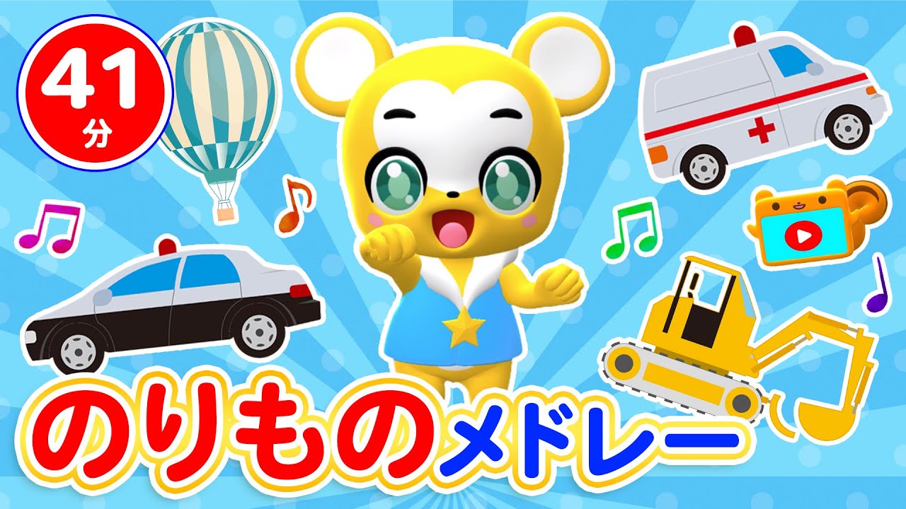 【41分連続】パトカー、消防車、救急車、電車が登場するのりものメドレー★はたらくくるま1、のりものステーション、はたらくくるま2、せんろはつづくよどこまでも、ちかてつ、等童謡・手遊び等全19曲