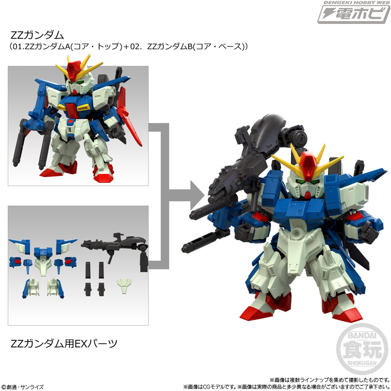 組立済み可動ユニット“MOBILITY JOINT”を搭載した、食玩ガンダムシリーズ「MOBILITY JOINT GUNDAM」。MOBILITY JOINTと各種パーツ&シールで完成するプラ製アクションモデルです。10弾は、「ZZガンダム」「キュベレイ」「リック・ディアス(クワトロ・バジーナ機)」「リック・ディアス」の4機のMSをラインナップ。ZZガンダムは「合体」を採用し、コア・トップとコア・ベースを組み合わせることで大ボリュームのZZガンダムが完成します。さらにEXパーツにより各種形態への武装強化が可能。全8種で展開。