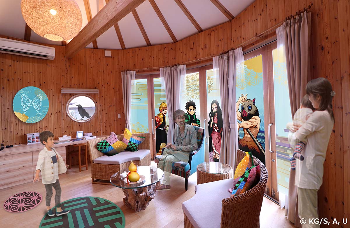 2025年3月15日(土)〜12月14日(日)の期間限定で、ニジゲンノモリ×アニメ『鬼滅の刃』の2つの特別なコラボルームが登場!「絆のコクーン」は、「巡る、絆の物語」をコンセプトに竈門炭治郎たち4人が紡いできた旅路と絆を体感できる空間。蝶屋敷をモチーフにデザインされたリビングと、藤の花の家紋の家をモチーフにしたベッドルームをご用意しています。最大3名宿泊可。
