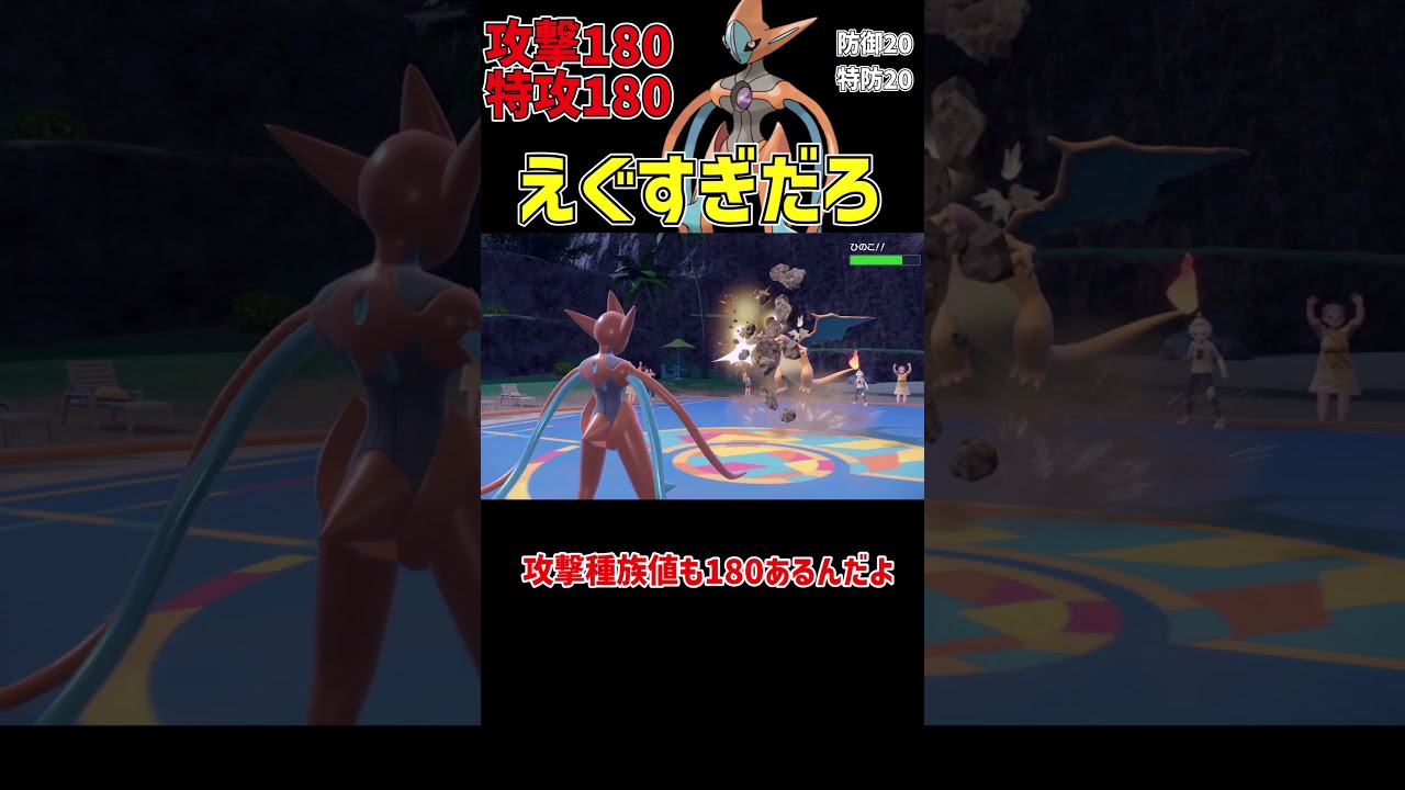 今日はどう考えても最強な。アタックでオクシスを使っていくよ。 今日はアタックでオクシスか。こいつはそんなに最強なのか。 特攻種属地が180。さらに威力140 のサイコブースト。これが弱いわけがないね。 この火力はさすがアタックでオシスだな。それでも特攻 2段階下がったしやばいだろ。 全く問題ない。攻撃手術値も 180あるんだよ。 特攻だけじゃなく攻撃もやばいのかよ。 これだけでは終わらない。素早さ属値が 150 もあるから大抵のポケモンは上から殴れるね。 攻撃特攻だけでなく素早さもやばいのか。 それでもこれだけ攻撃面が高いと防御面が低いんじゃないのか。 HPが50、防御と特防が20 で大体パモと同じぐらいだね。 耐久低すぎだろ、こいつ。 それでも問題ない。持ち物気合いの助だから耐久なんて関係ないね。 いきなりタスき向効うにされてるけどな。 なかなか小ざかしい技を使ってくるね。それでもパモごときに負けるでオシスじゃないよ。 普通に負けてるけどな。 いや、パモには負けるなよ。う。