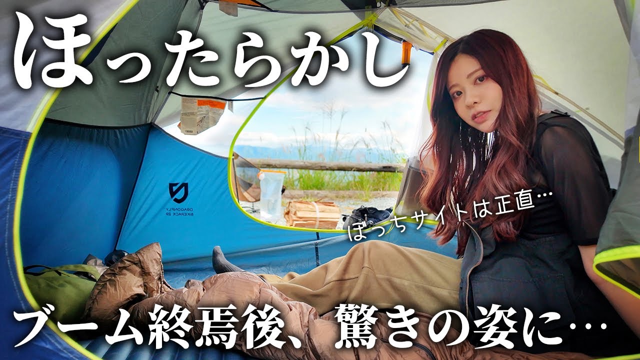 おはようございます。 おはようございます。 今はここは山梨県のスーパー琉球さんにきやきさんに来てます。はい。なゆちゃんと今日は一緒にキャンプします。 [音楽] グちゃんもいますよ。寄り道。道 いらっしゃいませ。 体長は種が入ってます。 で、えっと、セトジャイアンツドルチェ、サミードルチェオネシャインマスカットになります。ピオネは皮を出した方がいいかと。 はい、どうぞ。 ありがとうございます。 あ、種類を全部 おがんでる。 いただきます。 う、甘。 おったらかし温泉。 温泉 でおったらかしキャンプ。 キャピングフィールド。 めっちゃ天気よし。平日やけどほぼ満サ。車もめっちゃおる。ほったらかしキャンピングフィールドめっちゃおしゃれ。マ爪題系。あ、あった。こっちにバが人がいっぱいいます。とりあえず受付します。ぼっちサイトに向かいます。 こっちでます。 もうぼっちサイト以外は本当に予約取れないから。 うん。これがやばい。うわ、かき氷り食べた ぐらい暑いね。 暑い。さてさて、どんな感じでしょうか。 さ、さて、ランピングみたい。 ランピングみたいやな。 うん。 エアコンとかついてんのかな? ありそう いいな。 上の1番奥行こか。こか。 3 段なってて。 でかいな、この車。人のこと言われへんけど。 確かに 開いてるな。 奥2つ行きましょう。角から到着。 [音楽] 7番と8番角やから L字になってて広く感じる。 スーパーヘビーです。今日バックパック なしでキャリーだけ。 すげえ。帽子カブロ。帽子もあるし火も ある。 お、 暑 動かれへ。暑すぎて。とりあえず テント貼ったら灼熱やな。 今日は椅子を持ってきました。ヘリノックスちゃん暑すぎ。やばたになんだあんねんやろ。 33° びっくらポン椅子久しぶりに持ってきた。片付けがめんどくさいから冷たスタイルの方が好きなんやけど組み立ては超簡単やないな。 [音楽] 火が顎で挟みながらいい。 [音楽] [音楽] Аelujaeluja helujahalleluja heluja [音楽] heluJa. ありがとう。これがなかったら手札は無理 。やった。設営完成です。す。やば。暑い 。マジで火がさ。よし。居場所がない。 テントの中も暑いやろうし。 オアシスを見つけた。 ここで休もう。 よいしょ。 良きかな? よし、では カロリー気にしてるので コンビニで買うとカロリーがちゃんと書い てくれてるから助かる。ありがたい。最近 家にいる時は1200kcぐらい食べて ます。 いただきますじゃん。鶏そぼろ弁当。 うま 瞬殺完食。 ごちそうさでした。 あ、す、テントの方。 もしかしてテントの中は影だから涼しいん かな。 身の危険を感じた。 ここがちサイトの人が使うトイレかな。 ハイステ 自販機 シンクは1つしかないけどここが水場 こんな感じネットは置いてくれてるけど あれは初期洗剤じゃなくてえ、あ、水飲め ますって書いてあ、水入れるやつ持ってき たらよかった。せっかくこっちまで来たの に。男な、男の子じゃないわ。男、男、男 、女、女。 うん。綺麗。 ハンドソープはあった。 風速が5m程度以上を超えたら焚き火禁止 みたい。ってことは今はダメかも。風吹い てるって感じないけど。戻ってきた。 1分ぐらいかな?いや、2分ぐらい。 トイレまでめっちゃいい景色。今日は夜景 が綺麗に見えるんじゃないかなと思ってん ねんけど。でも富士山がどこか分かりませ ん。ちょうど雲で隠れてるんかな?カが 開いたままでほとんど中身出してない。 独等席 じゃん。影になった。もうテントの端っこ ぐらいまではこう影が伸びてきててんけど 、急に全体的に影に覆われました。全然 もう全然暑さが違う。やっとテントに 入れる私のカ。今からエアマットシュラフ もろやります。お乳のスリーカアディダス アディダス 景色やばい。 虫が入るから閉めとこう。大きい蜂が結構 飛んでる。バックパックでキャンプ行く時 はバックパックの1番底にシュラフを裸で 詰めて上からどんどん物入れてって圧縮 する形にしてんねんけど今日はキャリー だったのでモンベルの何だっけ?圧縮する やつヒューってヒューってやったら半分と までは言わないけど2/3ぐらいは結構 縮む。ナンガ900の方には確かLサイズ やったかな。このナンガ450の方にはS サイズのやつ使ってます。ま、詳細は多分 Amazonリンク載せとくから概要欄 からチェックしてみてください。キャリー の時はこうやって圧縮して入れた方が 小さくなって便利です。 はーい。膨らびました。 ポンポンポンポンポン 。シュラフはナンガの453シーズン用 です。最低気温が16° っていう天気予報もあれば13°っていう 天気予報もあんねんけど10°ぐらいまで 下がったとしてもこないだこの装備で山の 大腸のキャンプ場止まれたんで余裕だと 思います。水平を確認します。 滑る。あ、いい感じ。ああ、こ、こっちから入れるんちゃう? これはストロ。 ちょ、ちょ、ちょ、ここ止めるやつ。 ああ、すご。 これさ、口が広いからさ。 うん。 入れんのも早いし、あの、洗った後乾くのも早い。 あ、確かに