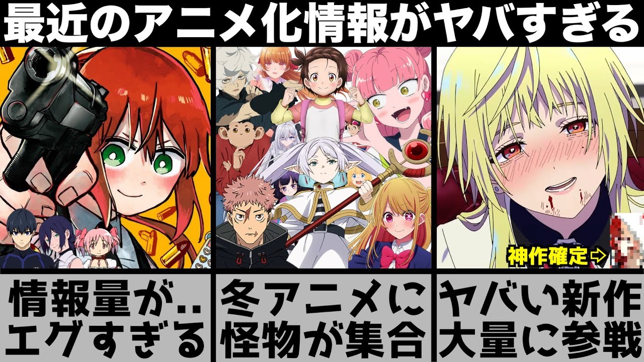 大量のアニメか。ということで今回は来年 以降のアニメの話を中心に色々触れていく んですが、2ヶ月分のアニメ化情報を まとめた動画となっているんで情報量は 半端ないです。そしてこの動画は紹介と いうよりかは来年以降の楽しみを一緒に 共有していこうぜっていう動画なんで触れ たことない作品は一部軽く紹介していき ますが基本的にざっくり触れていくんで 気軽に見てもらえれば嬉しいです。では、 まずは最近発表されたまだ時期が決まって いない作品。幼稚園ウォーズ。やっと アニメ家が決まりましたね。こちらは ジャンプラで連載されている作品なんです が、元伝説のコロシアである主人公のリタ が世界一安全な幼稚園の先生として 襲いかかる敵から演児たちを守るついでに 出会いもいくというとこから始まる殺しや かける幼稚園のアクションラブコメです。 めちゃくちゃ完潔に言えばイケメンとの 出会いを求めてる最強の幼稚園の先生の話 でアクション作品ではあるんですが、 コントの店舗が面白くてかなり見やすい 作品なんで間違いなく万人受けすると思う し、世間に受けるような作品の1つとして 人気が出るんじゃないかなと思っています 。抜カ管理。こちらはシリーズ累計部数が 213万部を超えてる作品で物覚えがいい という特技を持っている旅館がお見合いの 練習相手として皇帝と関わったことを きっかけに気に入られてしまうとこから 始まるんですが自覚はあるけど自信はない 。天才と呼ばれるような主人公にすごい 魅力のある作品で少し薬屋っぽい雰囲気を 感じました。すごい引きのある作品だった んで個人的に楽しみにしてます。いびって こない義母と義師。こちらはSNSで第1 話が28万いいねされたというとある家族 の話なんですが、これが思っていた以上に 面白くてコメディとギャグが中心の物語に はなってくるんですが、めちゃくちゃ平和 な世界戦でほっこりする作品が好きな人は 間違いなく好きになると思う。運命の 巻き戻し。こちらの作品はなんと世界一 分かりやすくて熱いループ漫画と歌って いる作品で実際に呼んでみたんですが確か にめっちゃ分かりやすかった。右目に宿る ループ能力を生かして何度も時間を 巻き戻しながら自故事件で亡くなった人を 救っていくという物語です。ライヤー ゲーム。こちらは大金を奪い合うという 心理戦が描かれている物語で実写で大 ヒットした作品なんで知ってる方も多いと 思うんですが実写化で人気になった作品 って全く話題になることなく終わって しまうことが多いんであまり期待しすぎず に楽しめたらなと思ってます。オタクに 優しいギャルはいない。こちらは女児向け アニメが好きなオタクの主人公がオタクで あることをきっかけにクラスメートの ギャル2人と仲を深めていくというオタク の夢が詰まったスクールラブコメディです 。そして他にもいろんな作品があって ブーンからの最強男、手札が多めの ビクトリア結界石の一輪無覚は今日も無 意識に力を垂れ流す。花おさんは転生して も喧嘩がしたいなど人気作品からマイナー 作品まで次々にアニメ化が決まっており ここで続編にも触れていきますがこれが とにかく楽しみ。ブルーロック続編制作 決定。第3期とは言われていないですが、 おそらく第3期のことだとは思ってます。 そしてブルーロックに関しては次の賞で あるネオエゴイストリーグが18巻から 34巻くらいまであって、アニメで言うと 3クール分以上の内容となっているんで、 かなり先になると思ってます。そしてこれ はあくまで僕の予想なんですが、わざわざ 第3期って言ってないのはネオエゴイスト リーグ編として全編後編に分けて放送する つもりなんじゃないかなと勝手に想像して います。もちろん第3クールの可能性も あるし、劇場を挟んでくる可能性もして きれないですが、第3期以降は時間かかっ てもいいんで、誰にも文句言わせない くらいじっくり作って欲しいですね。最終 回であれができたってことはその力を持っ てるってことだと思うし、ブルーロックの 致名度と人気があればお金を注ぎ込む価値 はあると思うんで、ストレートに行って しまえば第3期には大量の資金をかけて 欲しいですね。全エピソードとは言わない けど全ての見場をあのクオリティで見たい のが本音です。そして他にも自動販売機に 生まれ変わった俺は迷宮を彷徨う第3期 最強の錬金術師第2期世界のんびり農家第 2期リモンスター第2期俺は全てをパリー する第2期など続編も定期的に発表されて いてここで劇場版にも触れたいんですが ガールズバンドクライ完全新作映画政作 決定劇場版暗殺教室みんなの時間2026 年3月20日に公開決定新劇場版銀玉吉原 大園延長2026年2月13日に公開決定 メイドインアビスの劇場シリーズ目覚める 神秘が2026年に公開など劇場版も見 たい作品がどんどん増えていってます。 特に暗殺教室は歴代作品の中でもかなり 好きな作品なんで、ここに来て新規の エピソードが見