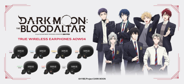本コラボレーションモデルは、「ヘリ、イアン、ジノ、ソロン、シオン、ジャカ、ノア」の7モデル。充電ケース天面に作品タイトル、左右ハウジングに月モチーフと各キャラクターのアイコンを配置。音声ガイダンスは各キャラクターの新規録り下ろしボイスを搭載し、電源オンやオフ、ペアリング時やタップ音等、各モデル計11ワードのオリジナルボイスを楽しめます。