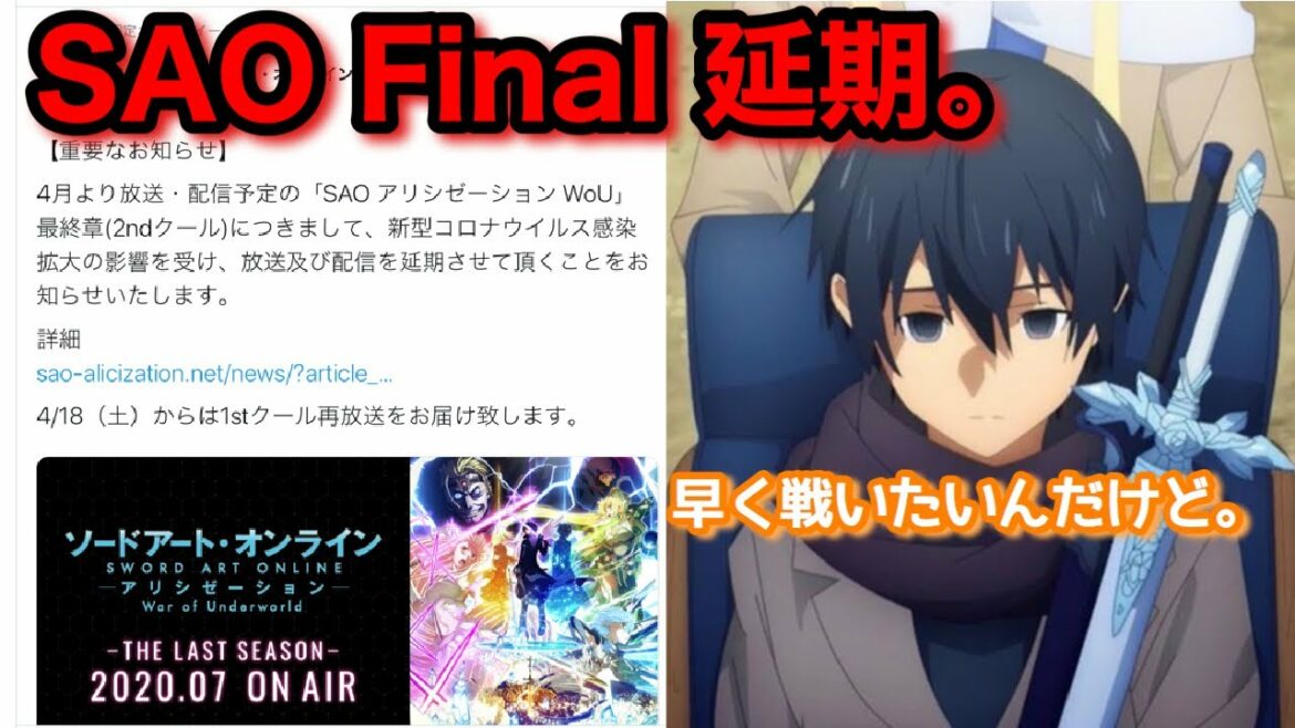 今回は、SAO アリシゼーション war of uederworld Final (2ndクール)が延期になった件について。春アニメも夏アニメもちょっともう分からん問題について。