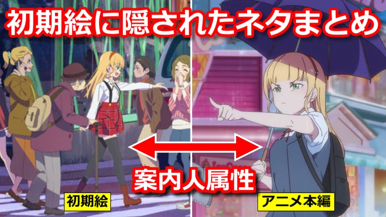 アニメ放送の1年以上前に公開された初期のキービジュアル。アニメ放送が終わった今振り返ると、いろんなネタが詰め込まれていたことが分かります。例えば、すみれがおばあさんに道案内をしていて、それはアニメ4話の内容と対応していました。