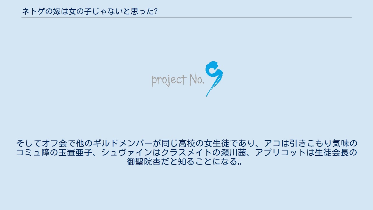 そしてオフ会で他のギルドメンバーが同じ高校の女生徒であり、アコは引きこもり気味のコミュ障の玉置亜子、シュヴァインはクラスメイトの瀬川茜、アプリコットは生徒会長の御聖院杏だと知ることになる。