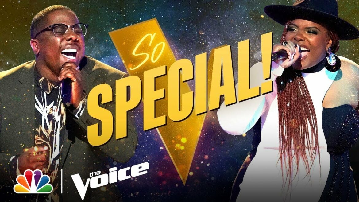 Aaron Hines and Gymani compete singing Tate McRae and Khalid’s “working” during The Battles on The Voice.