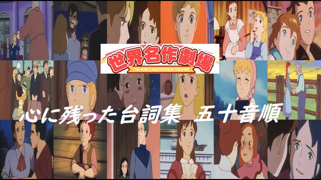 #世界名作劇場、#ペリーヌ物語、#小公女セーラ、#母をたずねて三千里、#ロミオの青い空、#小公子セディ、#牧場の少女カトリ、#愛少女ポリアンナ物語、#私のあしながおじさん、#フランダースの犬、#トムソーヤ、#ナンとジョー先生、#南の虹のルーシー、#ふしぎな島のフローネ、#家なき子レミ、#わたしのアンネット、#赤毛のアン、#少女コゼット、#七つの海のティコ、#あらいぐまラスカル、#愛の若草物語、#トラップ一家物語、#名言集