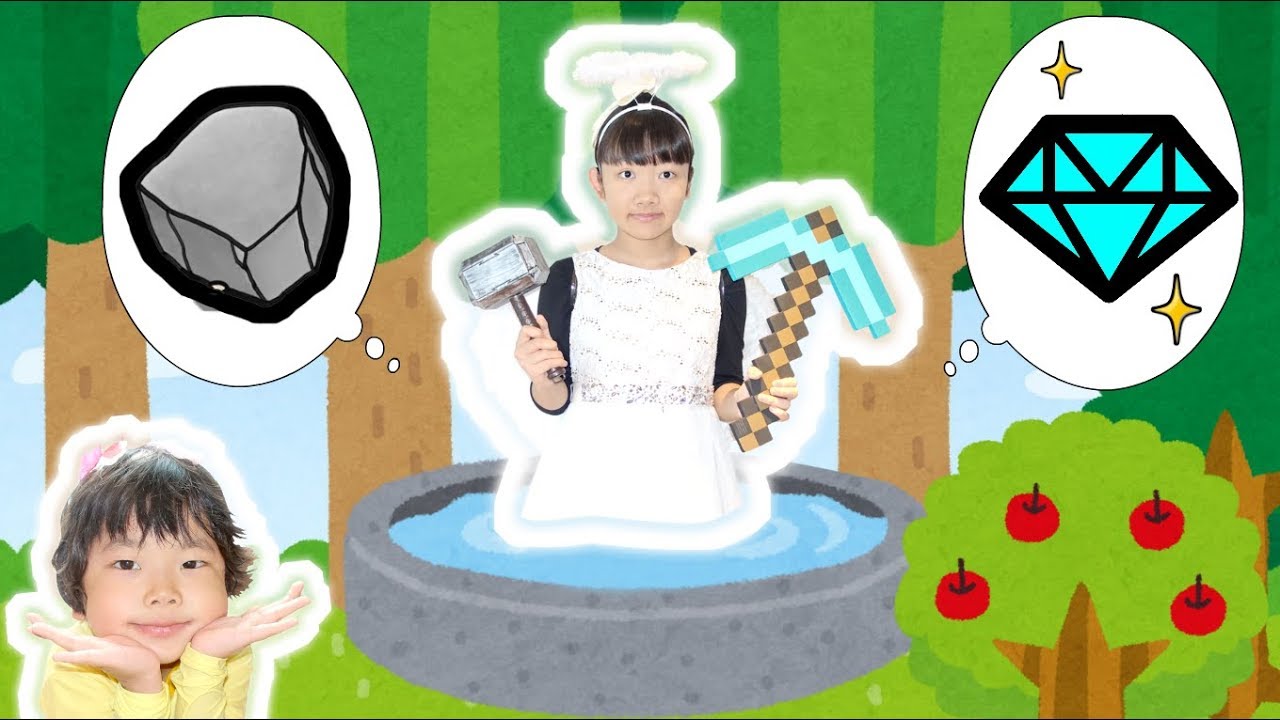 そこへひめちゃん女神様が現れ、「あなたが落としたのは石のハンマーですか?それともダイヤのハンマーですか?」と聞きます♪