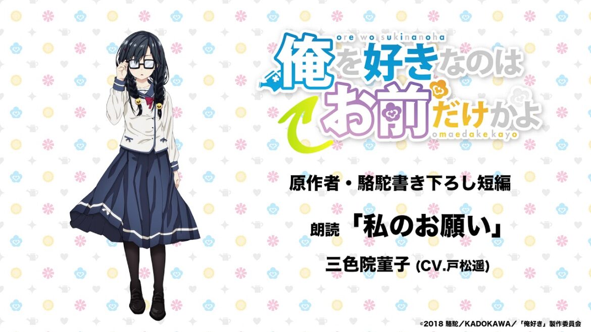 第22回電撃小説大賞《金賞》受賞作原作のTVアニメ『俺を好きなのはお前だけかよ』。2019年3月23日(土)、24日(日)に開催されたAnimeJapan 2019 アニプレックスブースにて先行公開された、三色院菫子(パンジー)役の声優・戸松遥による、原作者・駱駝書き下ろし短編「私のお願い」朗読音源をWeb公開! パンジーのキャラクターボイスはこの朗読が初解禁となります!また「私のお願い」は全文が「アニメガイド2019」に掲載されています。TVアニメの続報をどうぞお楽しみに!
